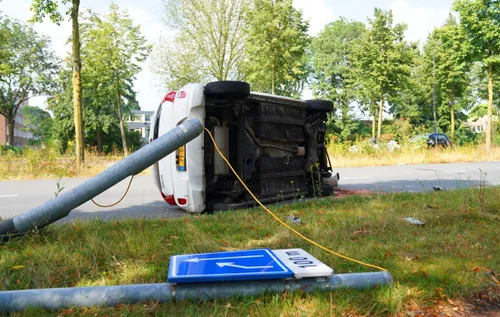 Een auto is donderdaop de kant beland bij een ongeluk op de Harendonkweg in Den Bosch. De bestuurder raakte van de weg en botste tegen een lantaarnpaal in de berm. Hierdoor werd het bord uit de grond getrokken en kantelde de wagen.