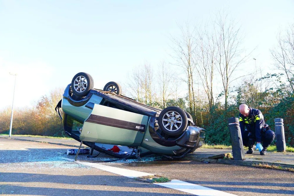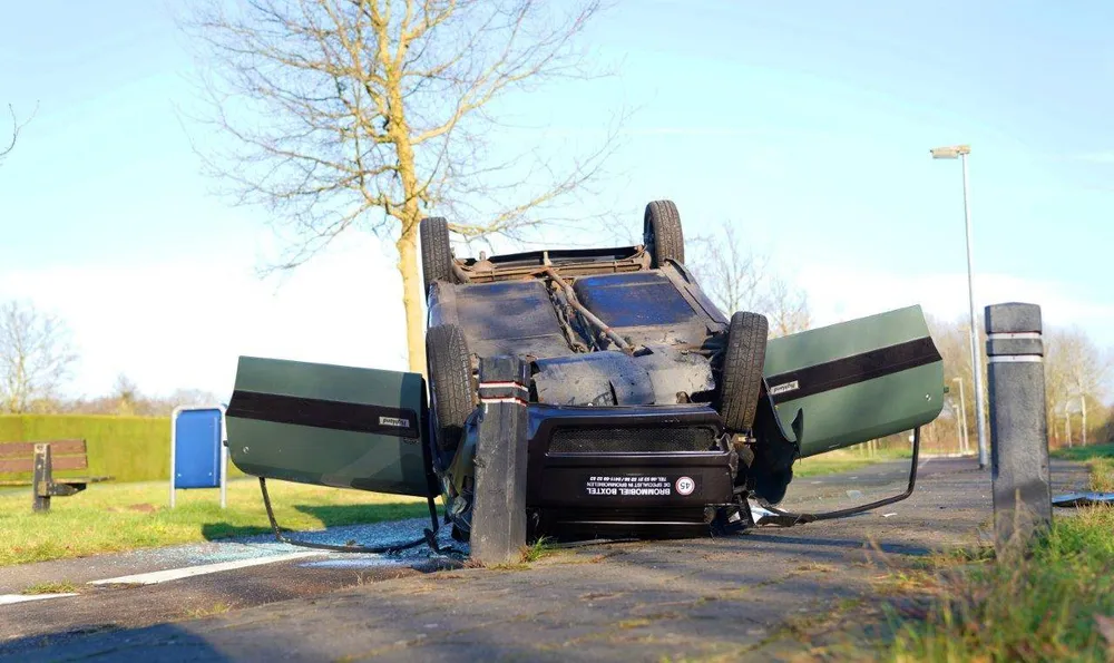 De man en vrouw die in de auto zaten, zijn ter controle naar het ziekenhuis gebracht met lichte verwondingen. In de bocht van het fietspad, dat tussen de Rijksweg en de Coppensdijk loopt, ging het mis. De auto belandde op de kop op het fietspad. Hoe de bestuurder daar terechtkwam, is niet bekend.