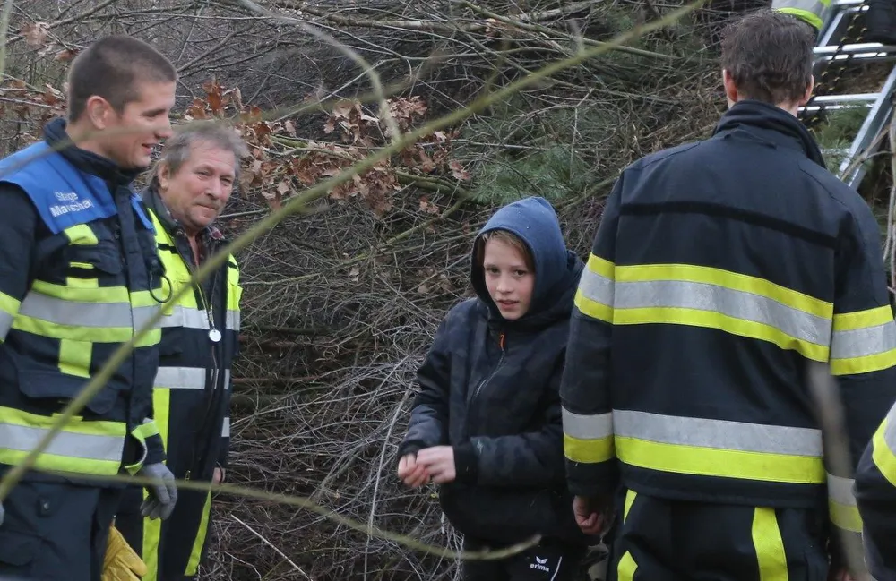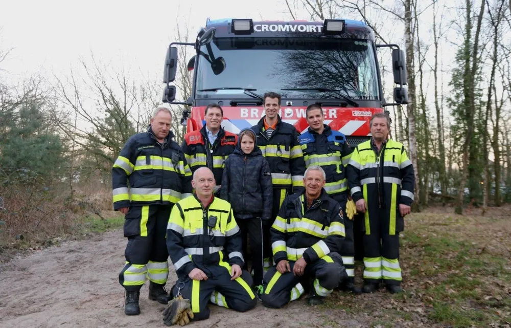 Dat was schrikken voor de jongeman, maar na de reddingsactie ging Mats met zijn helden van de Cromvoirtse brandweer op de foto.