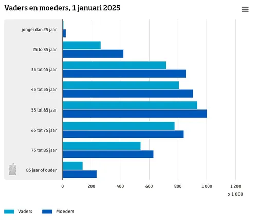 In de leeftijdsgroep van 35 tot 75 jaar is het verschil kleiner, waarna het weer groter wordt. Dat heeft er vooral mee te maken dat mannen gemiddeld minder oud worden dan vrouwen. Er zijn ruim anderhalf keer zo veel moeders als vaders van 85 jaar of ouder.