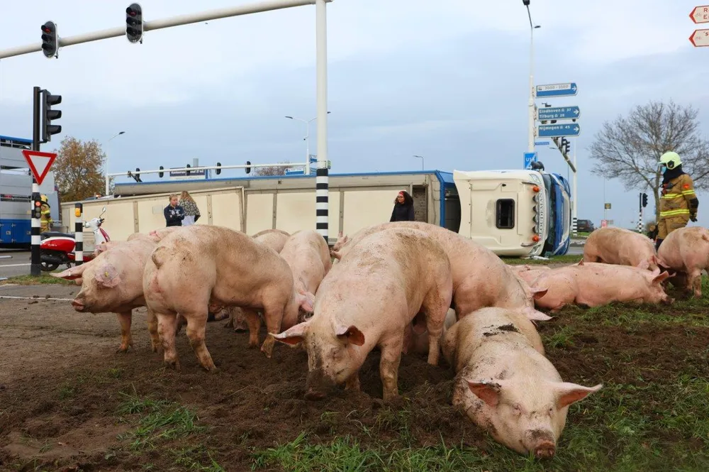 Een vrachtauto is woensdagmiddag gekanteld op de hoek van de Bossche Bruistensingel. De man was met zo'n 180 varkens onderweg naar een slachterij in Boxtel. De chauffeur wilde linksaf naar de A2 rijden. Het stoplicht stond op groen en toen het oranje werd, gaf de man er nog wat gas bij. En dat was dus teveel.