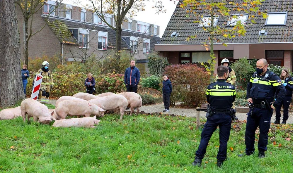 kijken, wat weer veel bekijks opleverde van buurtbewoners. ,,Ik denk niet dat er varkens verder de wijk in zijn gegaan. Ze blijven het liefst bij elkaar'', zegt de chauffeur die ziet hoe agenten en brandweerlieden een stel varkens begeleidt naar een vrachtwagen waarmee ze mogelijk hun laatste reis maken.
