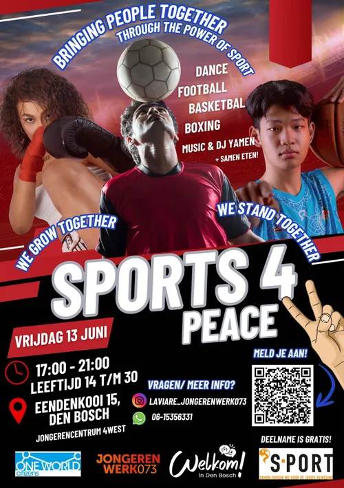 Op vrijdag 13 juni 2025 trappen 30 jongeren uit ‘s-Hertogenbosch samen met 30 jongeren uit Kenia, Rwanda en Nepal het eerste Sports 4 Peace-toernooi af bij Jongerencentrum 4West in Schutskamp in ‘s-Hertogenbosch. Het initiatief komt van ONE WORLD Citizens in samenwerking met Jongerenwerk073, ’S-PORT, Welkom in Den Bosch en Ambassade voor Vrede en is een unicum in Nederland.