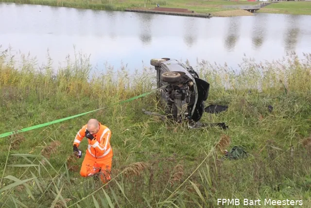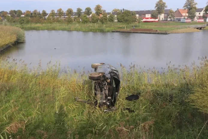 De auto lag op z’n zijkant aan de waterkant, onderaan het talud bij de Vlijmenseweg. Vermoedelijk is de bestuurder ermee enkele keren over de kop geslagen. De bestuurder was spoorloos maar de politie weet wel van wie de auto is. Een berger heeft de auto weggesleept.